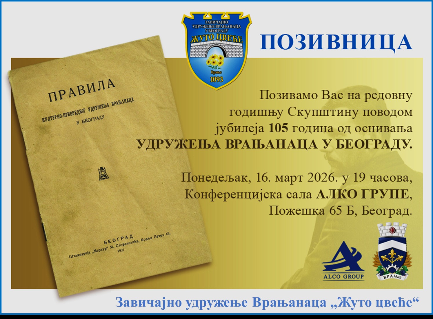 РЕДОВНА ГОДИШЊА СКУПШТИНА Завичајног удружења Врањанаца „Жуто цвеће” у Београду одржаће се у понедељак, 16. марта 2026. године. Детаљне информације о термину и месту одржавања скупштине са дневним редом биће ускоро објављене на сајту удружења.